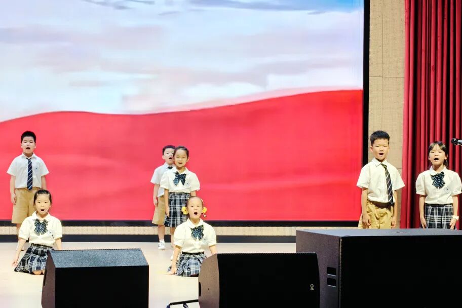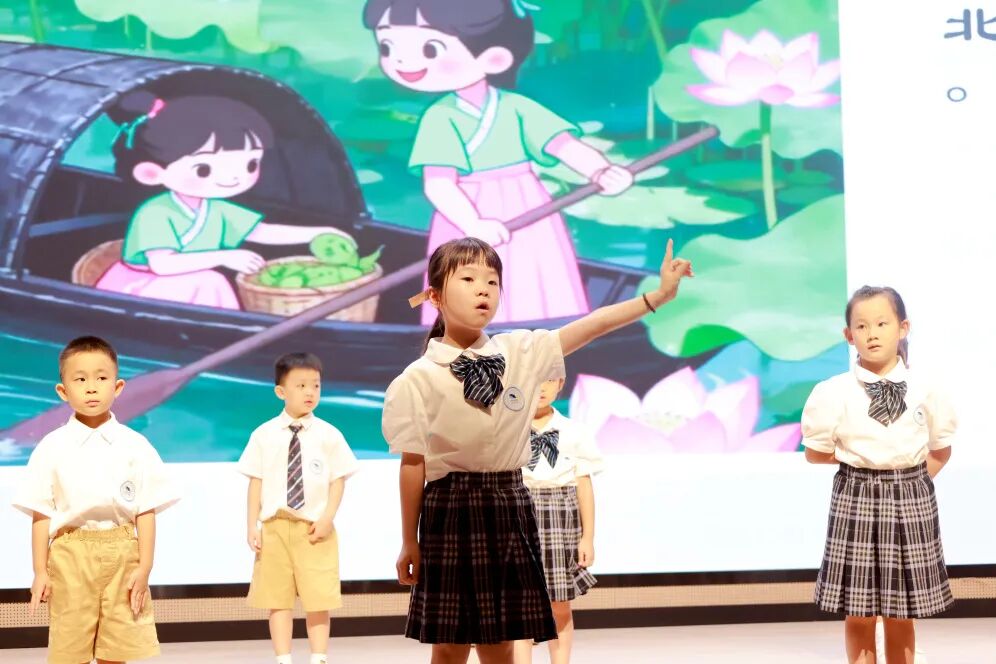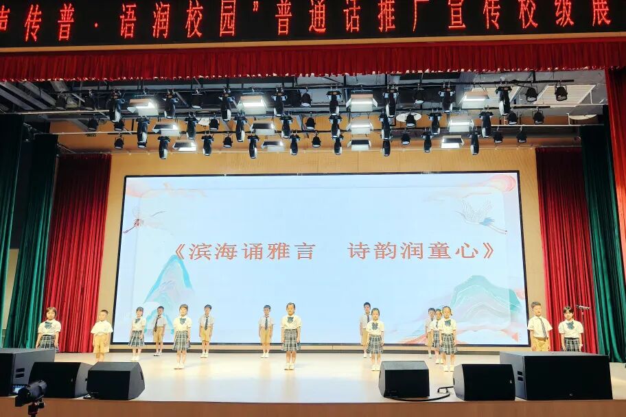 16名朗诵小达人齐聚报告厅,合作完成《滨海诵雅言,诗韵润童心》的集体朗诵。孩子们声情并茂,动作大方得体,让文字与画面、旋律交融,为我们呈现了一场沉浸式的语言盛宴。