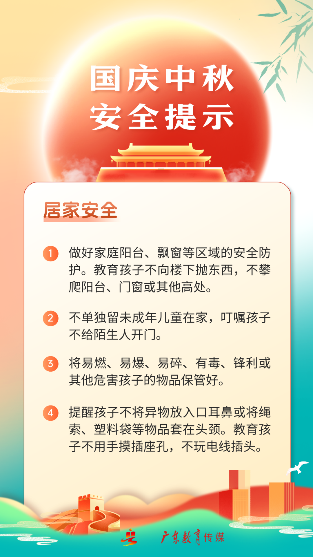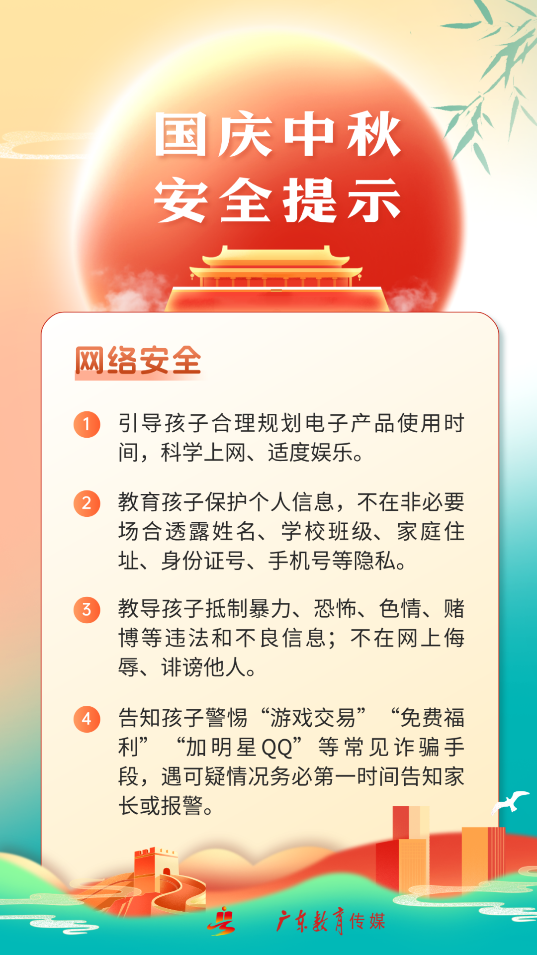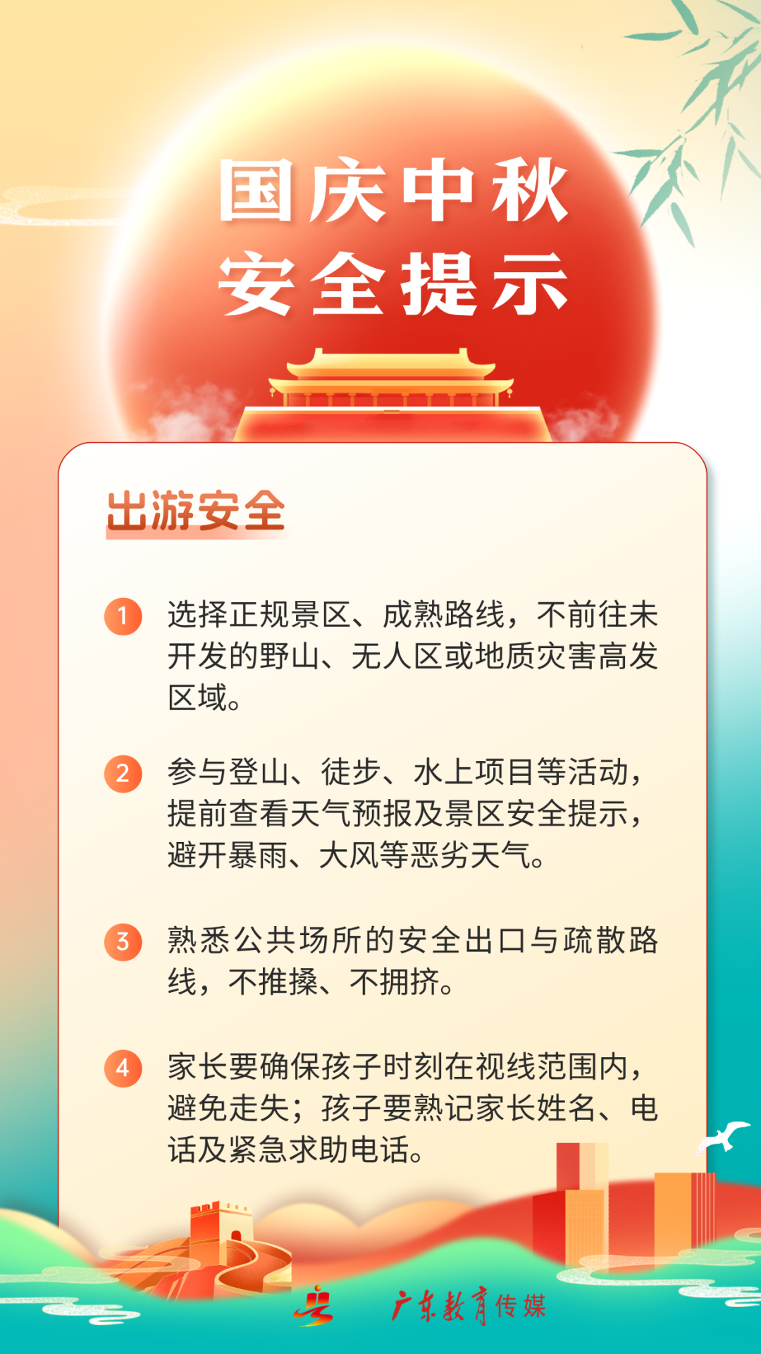 国庆假期恰逢中秋,在欢乐团聚的同时,别忘了将安全放在心间,祝愿各位师生家长节日快乐,阖家幸福,平安团圆!
