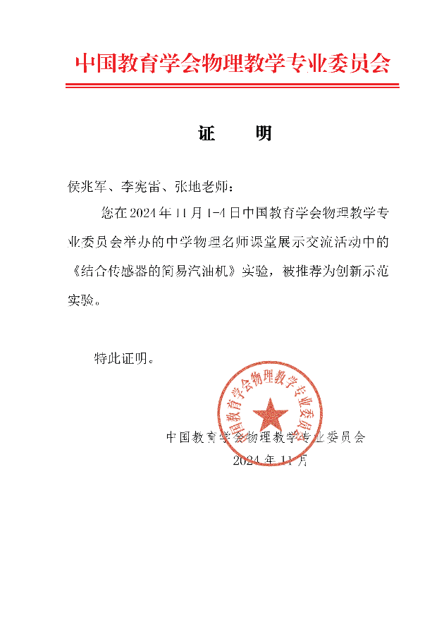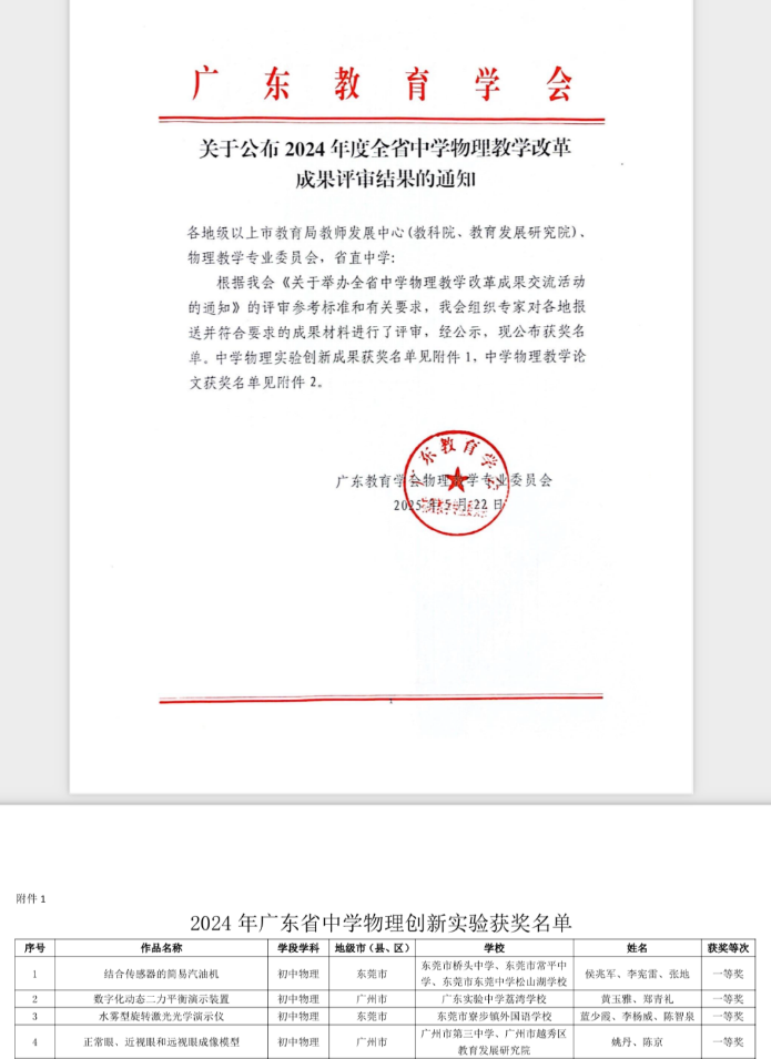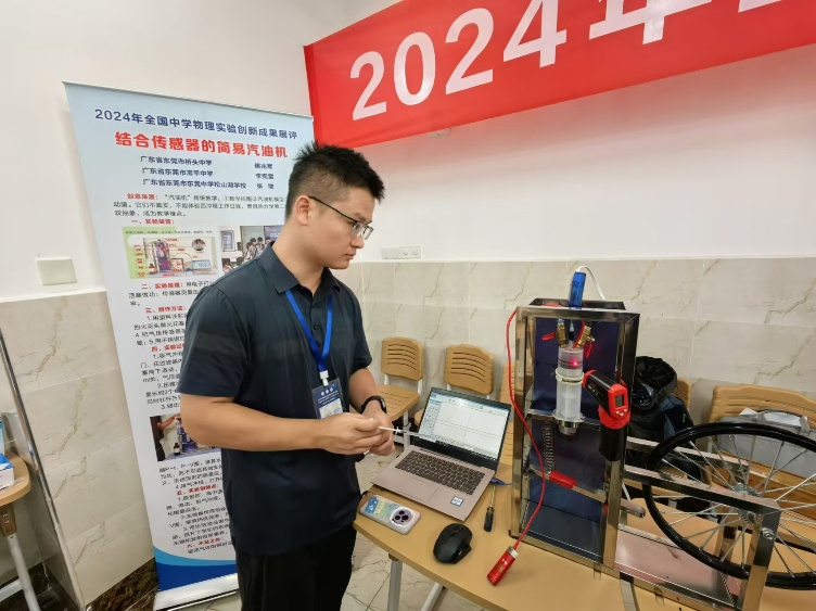 在刚刚落幕的“2025年中学物理学术年会暨全国名师课堂教学展示活动”中,由东莞中学松山湖学校张地老师作为第三作者参与研发的创新物理实验教具——“传感器探测的四冲程爆燃热机”,经激烈角逐,从全国初中组110项参展实验中脱颖而出,荣获总分第五名的优异成绩!