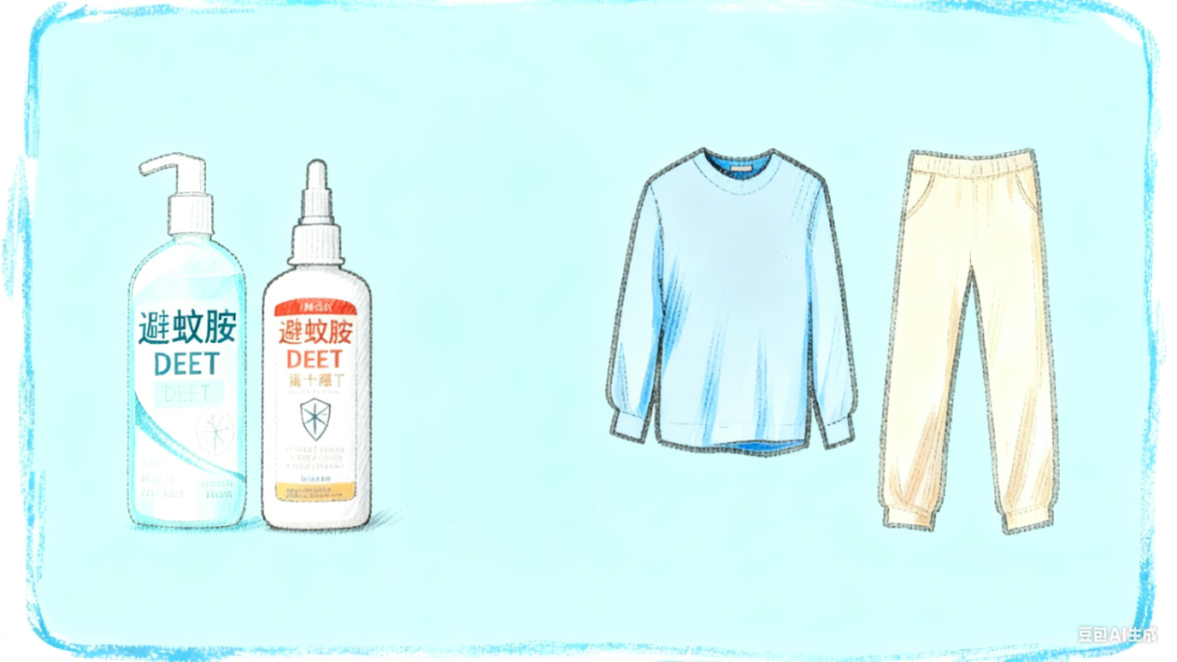 准备含避蚊胺(DEET)、派卡瑞丁等有效成分的驱蚊剂(10%避蚊胺有效约4~6小时,20%派卡瑞丁可达8小时);