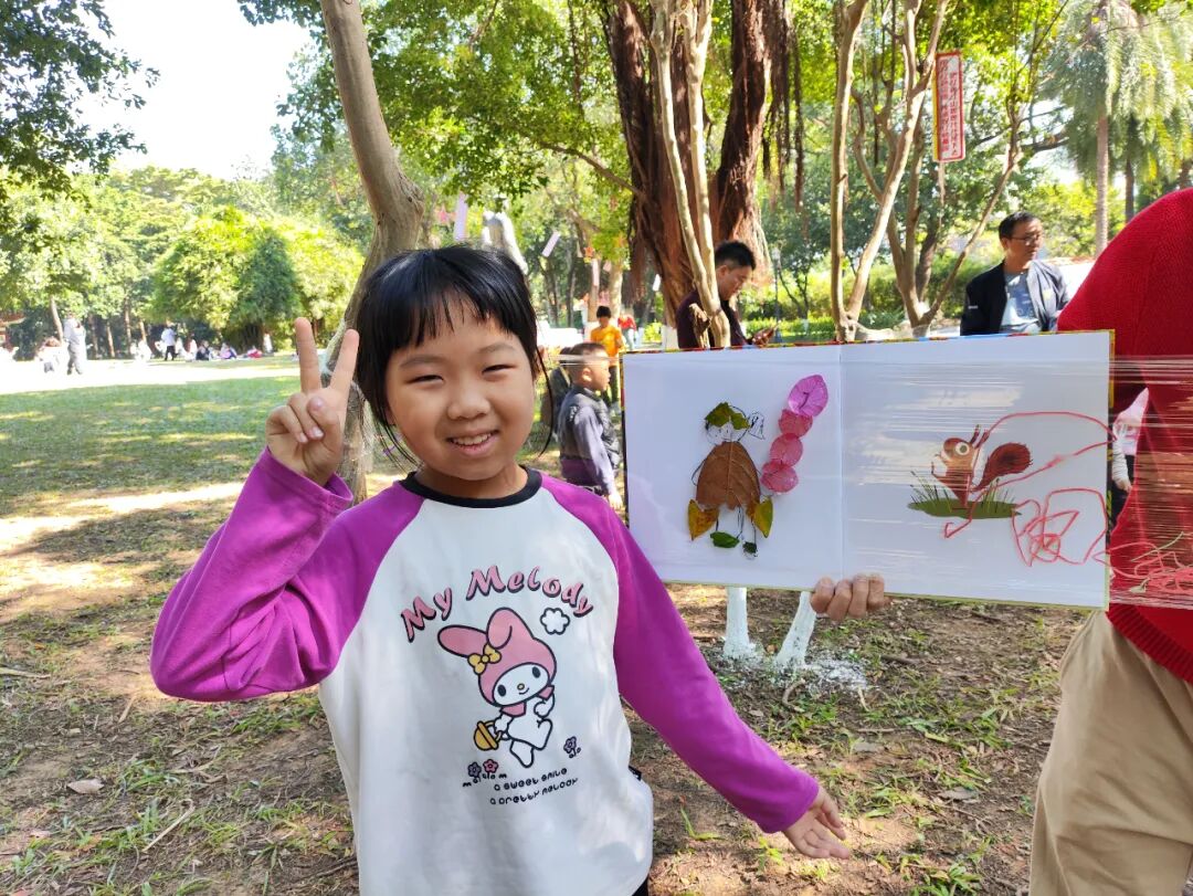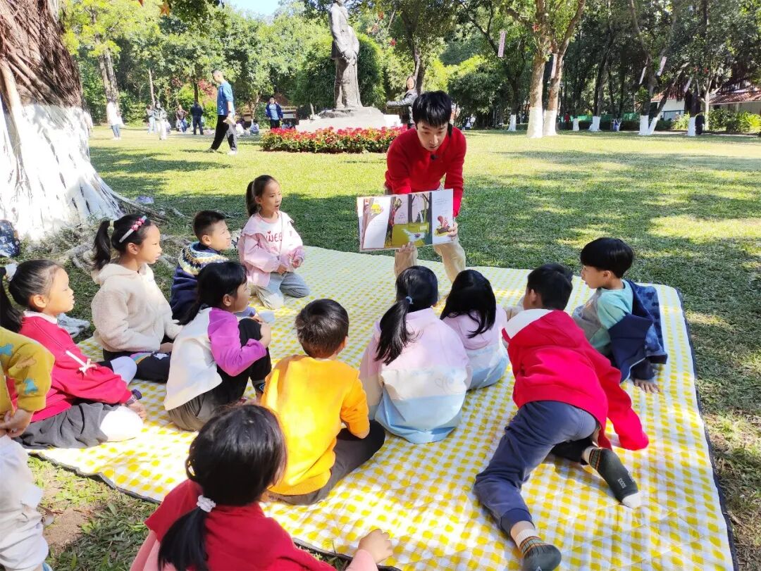 活动一开始,志愿者老师便为现场孩子们带来绘本故事《树叶小偷》的精彩分享。在公园的草地上,孩子们围坐成圈,聆听老师讲述“是谁悄悄偷走了秋天的树叶”,在充满趣味的情节中开启了对自然的探索之旅。