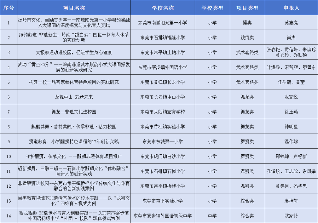 本次入选案例涵盖舞狮类、舞龙类、武术套路类、跳绳类、综合类等多个类别,既有深耕非遗传承十余年的品牌项目,也有创新融合体育与德育、美育的特色课程,体现了我市中小学在民族传统体育教育上的系统性、创新性和实效性。
