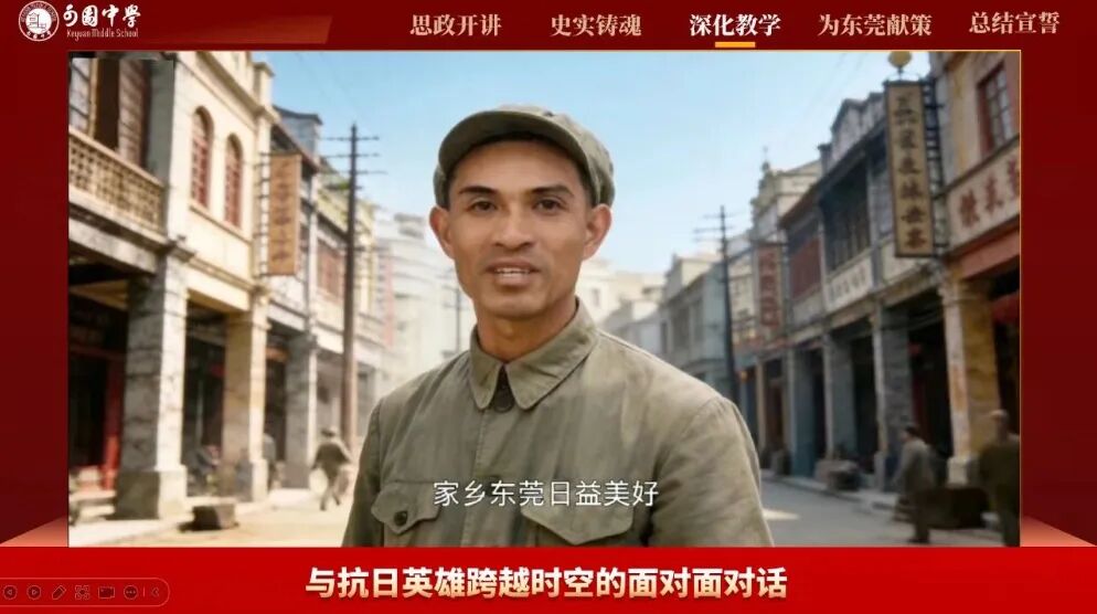 可园中学以 “东江边榕树下的思政课” 为纽带,串联东江纵队纪念馆、可园博物馆两大红色与文化阵地,创新融入AI 跨时代对话,让学子与革命先辈隔空对话、精神共鸣,结合研学实践、红色家书、三句半展演等形式,传承东纵精神,立志争做担当民族复兴大任的时代新人。