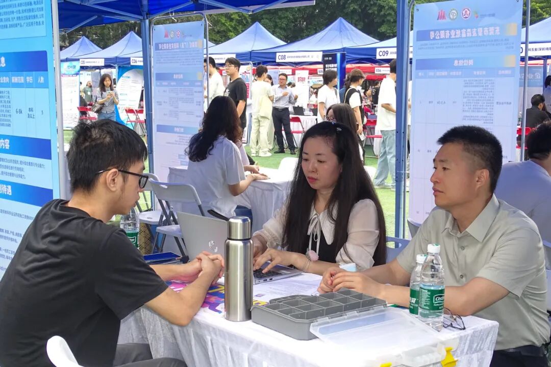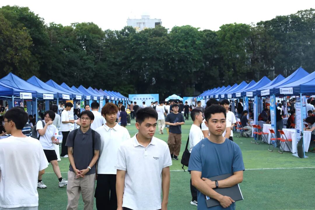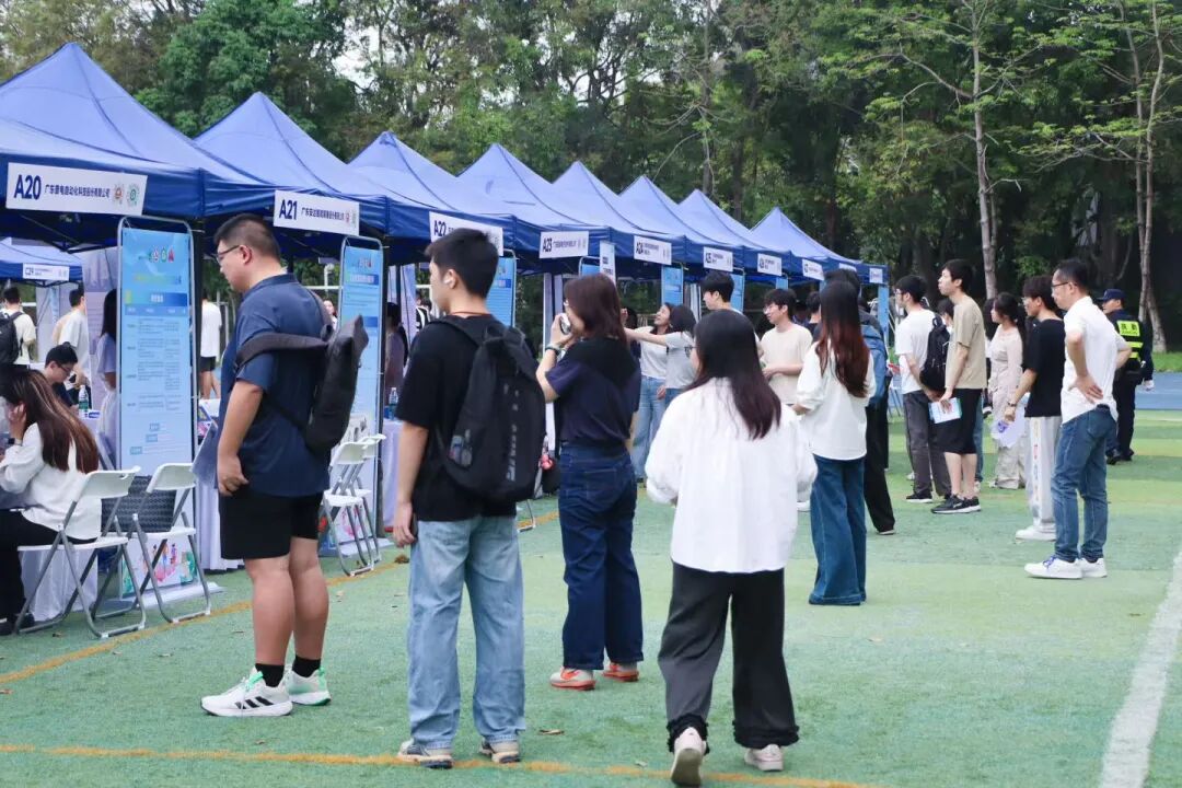 当天上午10时,假草田径场上,红蓝帐篷整齐列阵,现场人头攒动,热闹非凡。求职学子们手持简历,穿梭于各个展位间,与企业招聘人员面对面深入交流。