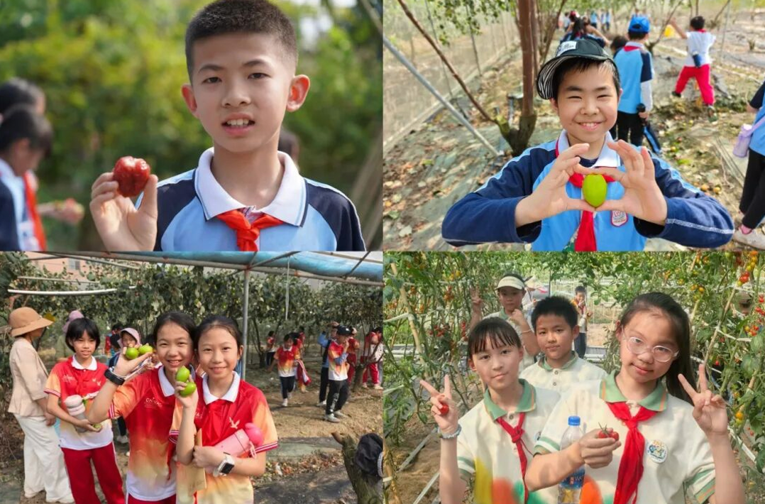 樟木头镇实验小学带着孩子们走进农庄摘桑葚、砍甘蔗、亲手榨汁,果香伴着笑声,孩子们在分工合作中学会分享与珍惜;麻涌大步实验小学请来家长农技员带队,在农场里认识果蔬、体验采摘,亲近自然的同时,也养出了热爱生活、细心观察的好习惯。