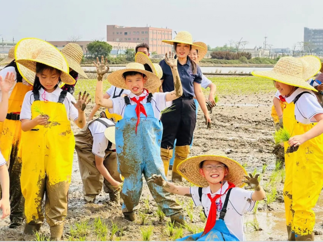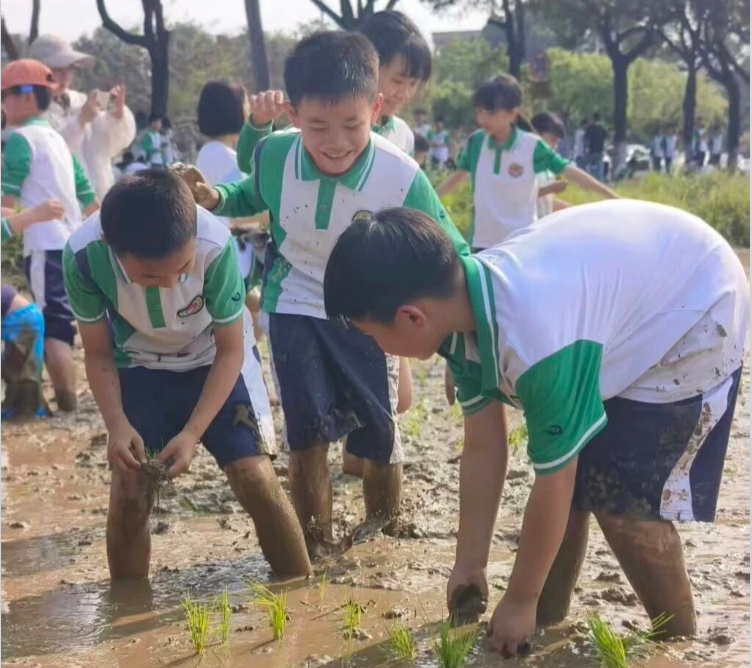 嘉荣外国语学校创新“播三嘉苗”环节,孩子们头戴草帽躬身插秧、诵读《春耕赋》行耕礼,在沉浸式劳作中体会劳动真谛,让劳动育人落地生根。