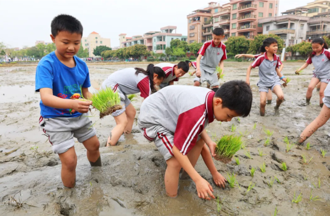 横沥几所学校——东莞中学横沥学校、横沥实验学校、横沥第二小学,还有道滘新城小学都带着孩子们走进稻田插秧。脚下是软软的泥土,眼前是连片的水田,孩子们从一开始小心翼翼、怕脏怕累,到后来互相打气、熟练插下一棵棵秧苗,在坚持里褪去娇气,在协作中学会担当。