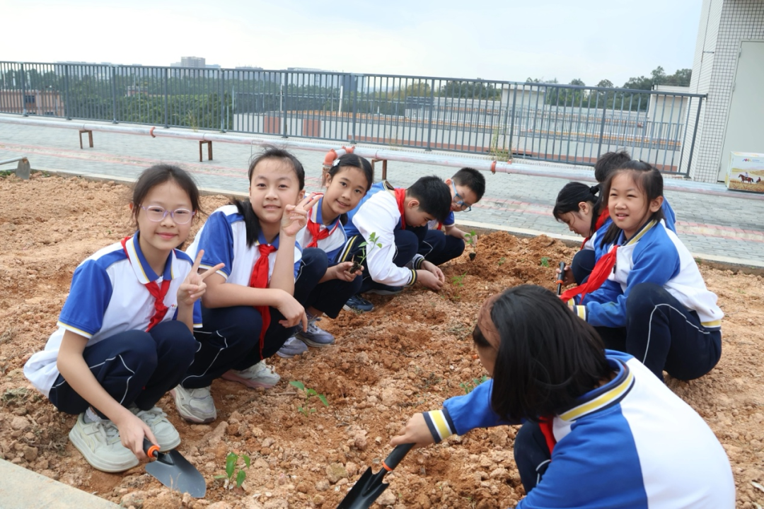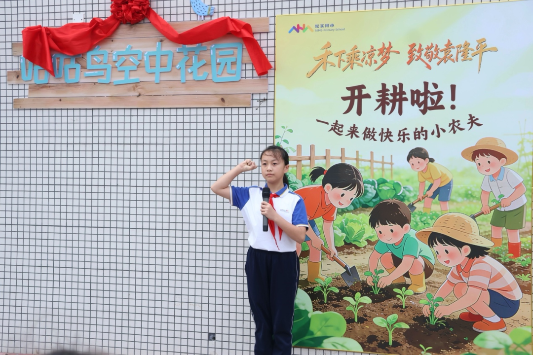 东坑镇第三小学(松实附小)也很有仪式感,在“咕咕鸟空中花园” 举行开耕仪式,以“禾下乘凉梦”致敬袁隆平院士,授田、赠种、庄严宣誓,把劳动的意义、家国的情怀,一同种进孩子们心里,让小小少年在躬耕中立志,在成长中向阳。