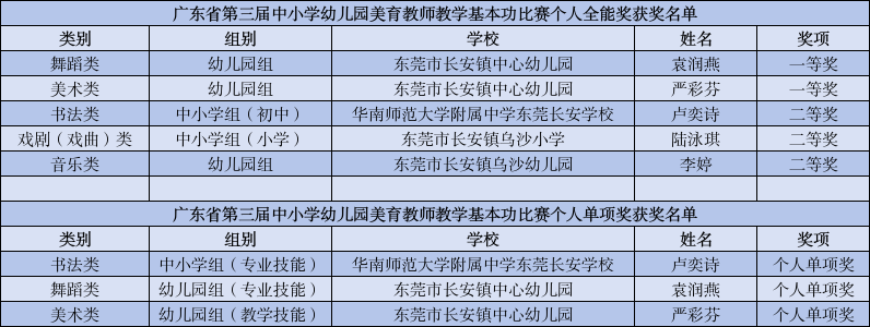 东莞市长安镇中心幼儿园教师袁润燕斩获舞蹈类幼儿园组全能一等奖,同时荣获该类别专业技能个人单项奖;东莞市长安镇中心幼儿园教师严彩芬获得美术类幼儿园组全能一等奖、教学技能个人单项奖;华南师范大学附属中学东莞长安学校教师卢奕诗将书法类中小学组(初中)全能二等奖、专业技能个人单项奖收入囊中;东莞市长安镇乌沙小学教师陆泳琪、乌沙幼儿园教师李婷分别获得戏剧(戏曲)类中小学组(小学)、音乐类幼儿园组全能二等奖。