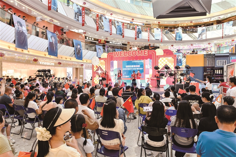 随后,《我和我的祖国》《天耀中华》等一首首经典爱国歌曲轮番唱响,全体歌手饱含深情的演唱引发台下观众强烈共鸣,现场市民纷纷跟唱,优美旋律在商圈中久久回荡,浓浓的爱国情怀在歌声与互动中不断升温。