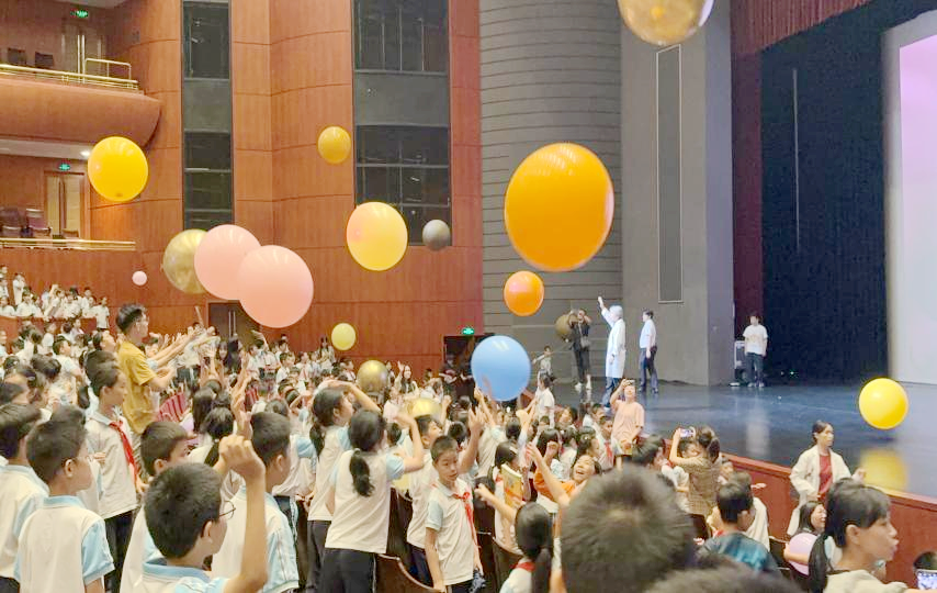 整个舞台空间被打造为一个充满奇幻色彩的“巧克力工厂”。从“巧克力瀑布”到漫天飞舞的气球,从贪吃的奥古斯塔斯到沉迷电视的迈克,剧中场景与角色活灵活现,使学生仿佛置身于旺卡的魔法世界。在主题分享与趣味互动环节中,孩子们积极投入,尽情释放想象力,于游戏中感知幸福、于体验中学习成长。