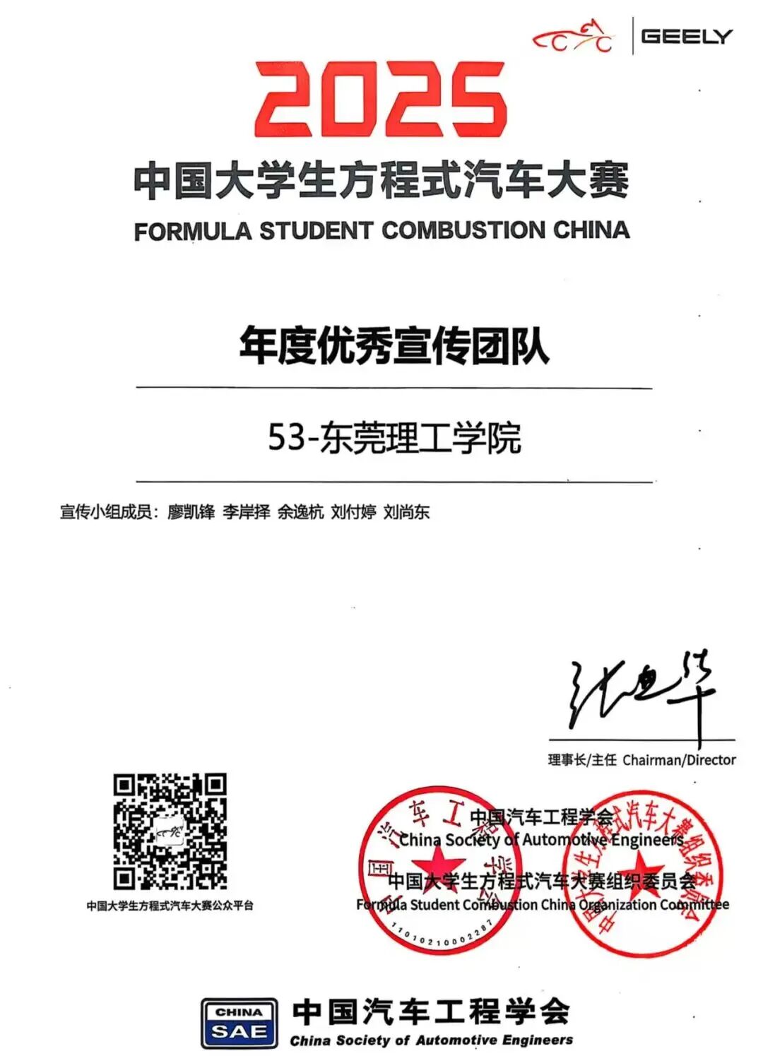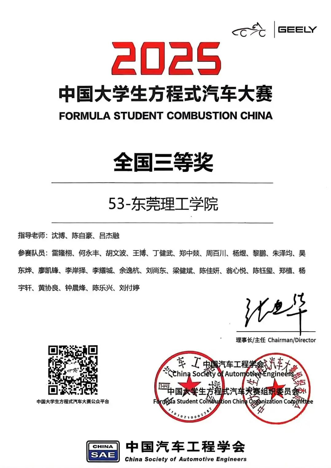 经过5天激烈的角逐,莞翎D_racing车队顺利完成车检、动态赛、商业报告等全部项目,首次圆满完赛,创造了东莞高校车队的历史性突破。其中,空气动力学设计斩获全国第七,商业报告斩获全国第十,最终拿下全国三等奖的佳绩。