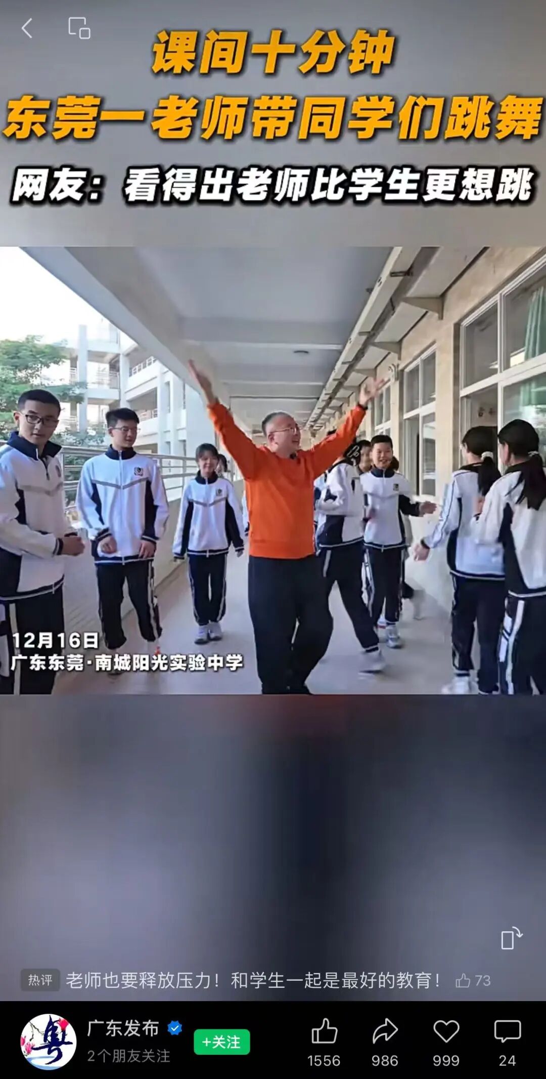 欢快的节奏、充满活力的舞步、师生脸上洋溢的灿烂笑容,与“严肃课堂”形成奇妙反差,瞬间抓住了网友的心。大家纷纷感慨:“看得出来,老师很想跳,也很会跳。”“做个阳光少年,赞赞赞!”