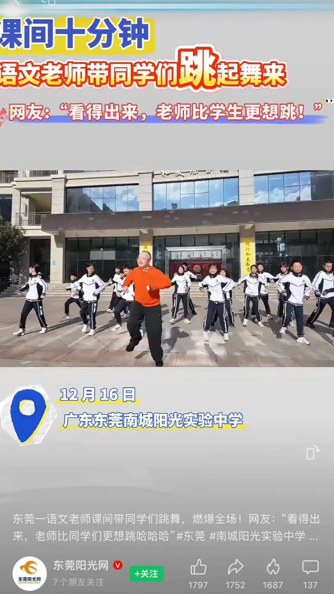 近日,东莞一位老师带学生跳舞的视频火了!视频的主角是来自东莞南城阳光实验中学的语文老师赵卓,他利用课前十分钟,带领全班学生齐跳当下热门舞蹈,活力十足。其实,赵卓老师此前在校运会开幕式带领老师们跳舞的视频就已经获得中国日报、南方都市报多家媒体报道,这次他与学生共舞的视频又相继被广东发布、东莞阳光网等媒体转发报道,吸引众多网友关注。