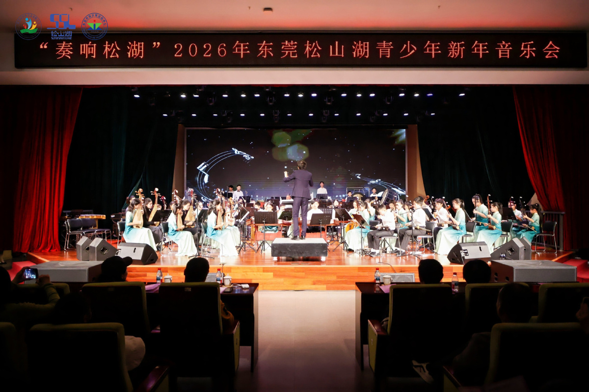 冬日暖阳映松湖,乐声悠扬贺新春。12月27日下午,东莞市青少年活动中心松山湖分中心星光剧场内座无虚席、掌声如潮,“奏响松湖”2026东莞松山湖青少年新年音乐会在此精彩上演。松湖少年民族乐团与松湖青少年室内乐团两支优秀青少年音乐团队联袂登台,以饱满的热情和精湛的技艺,为现场观众奉献了一场融汇中西、传统与现代交织的音乐盛宴,展现了松山湖园区青少年昂扬向上的艺术风采与扎实的美育成果。