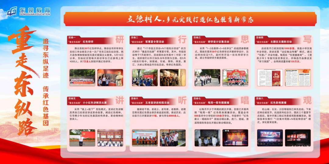 党建引领铸魂育人,筑牢教育发展方向标。东莞教育始终坚持以习近平新时代中国特色社会主义思想为指导,把党的领导贯穿教育工作全过程各方面。通过深化党史学习教育、建强基层党组织战斗堡垒、纵深推进全面从严治党等系列举措,为教育事业发展提供了坚强的政治保障和思想引领;推进大中小学思政课一体化建设,开展“重走东纵路”系列活动,深化红色基因传承,擦亮“红色思政”“科创思政”品牌,培养一批又一批担当民族复兴大任的时代新人。