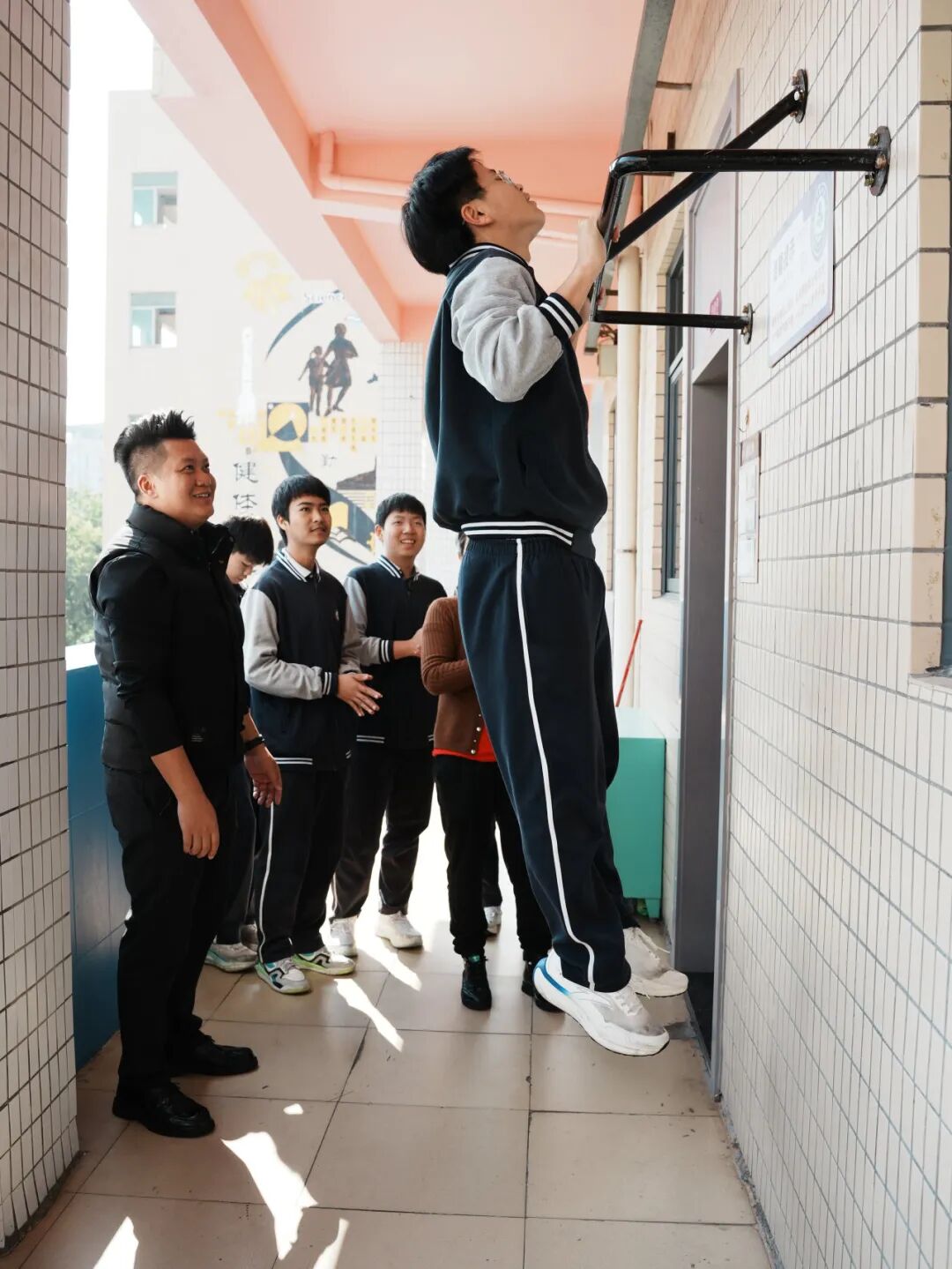 这些依据人体工程学原理、按学生身高特点量身定制的单杠安装启用后,宿舍走廊变身即时的“健身角”。清晨天色微明,已有学生在此拉伸热身、挑战自我;午休间隙,同学们三三两两聚在杠前,互相指导动作、交流心得;晚自习前后更是热闹非凡,学生们自发排队练习,加油声、计数声、掌声此起彼伏。