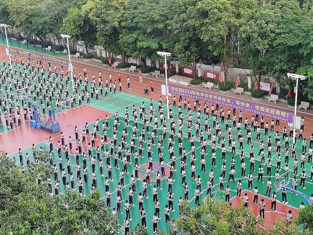 除了宿舍区的创新设施,学校更着力营造全天候的运动生态:清晨,初中部的跑操队伍步伐整齐、口号响亮;小学部的大课间活动则融合花样跳绳、跑操与韵律操,孩子们舞姿优美、律动十足。课间时分,低年级学生在色彩斑斓的地绘乐园里游戏、跳跃,欢声笑语不断。晚间运动时段更是丰富多彩:篮球场上角逐激烈,体艺馆内醒狮腾跃,田径场上耐力跑者身影矫健,体操器械区锻炼专注,羽毛球场上挥拍灵动……校园各处涌动着运动的热情与活力。