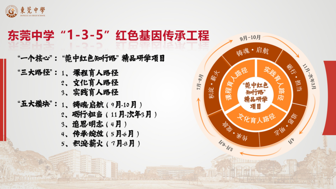 东莞中学“1-3-5”红色基因传承工程以“知行合一、浸润育人”为核心理念,构建了“一个核心项目、三大育人路径、五大行动模块”的全链条思政育人体系。项目以“莞中红色知行路”精品研学为核心,整合校内红色遗址与地方革命资源,打造“行走的思政金课”;通过课程、文化、实践三大路径,推动红色教育与学科教学、校园文化、社会实践深度融合;并围绕学年时序设计五大主题模块,实现红色教育的常态化和时序化浸润。
