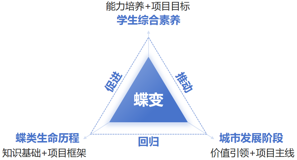 本项目以“蝶变”为核心主线,将城市生态治理历程、生物生命周期演变与学生素养成长轨迹三重叙事有机融合,构建了完整多维的课程框架。通过“沉睡的卵-成长的虫-蛰伏的蛹-展翅的蝶”四阶段课程设计,将抽象的生态理念与思政价值转化为具象化的学习体验,使学生在任务开展过程中自然建立起个人成长与城市发展、生态保护的内在联结。