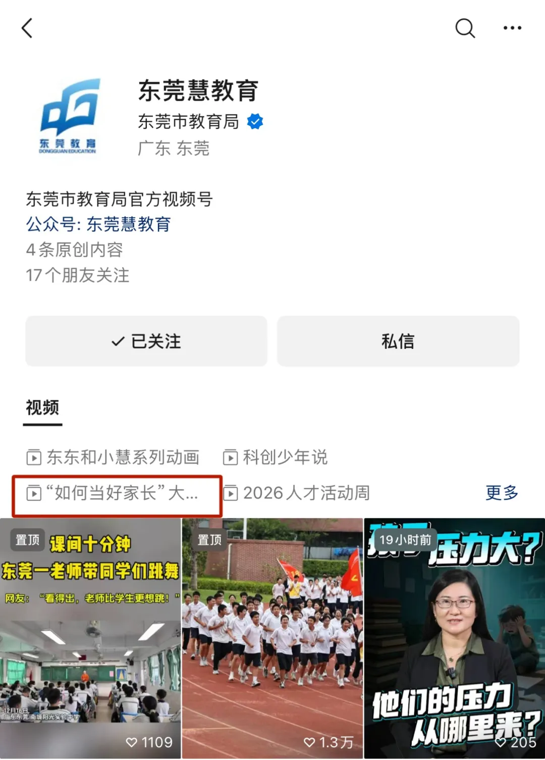 寒假是开展亲子陪伴、优化亲子关系、学习科学育儿方法的黄金时期。为方便广大家长学习这些兼具温度与专业性的家庭教育微电影,市教育局已完成27期“‘如何当好家长’大家谈”家庭教育微电影的整理汇总工作,正式向社会发布。打开“东莞慧教育”视频号,点击“‘如何当好家长’大家谈”(如下图)即可观看。
