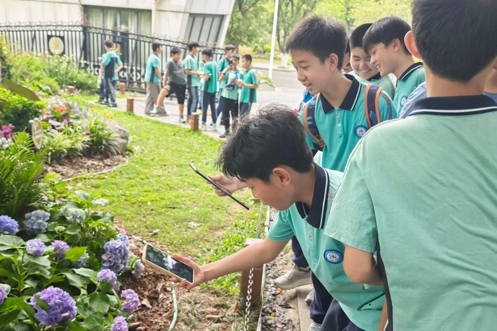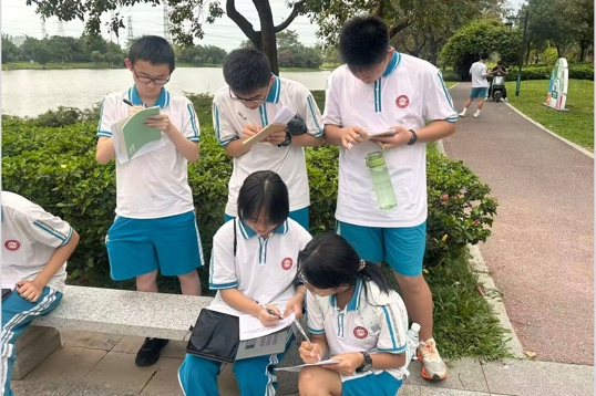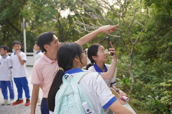 东莞中学初中部与东莞市第十一中学的师生分别走进虎英公园与银山湿地公园,两校学子均借助“形色”“花伴侣”等AI识物工具,分别识别湿地植物、公园草木,了解水生植物净化水质的作用及各类物种的科普知识,在自然观察中厚植生态情怀。