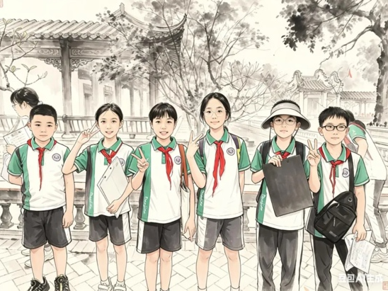 万江实验小学、望牛墩新联小学、道滘镇中心小学的孩子们,在古色古香的园林、绿意盎然的公园拍合照,AI一键生成水墨画风格的作品,古韵和科技碰撞,每一张都特别有纪念意义。