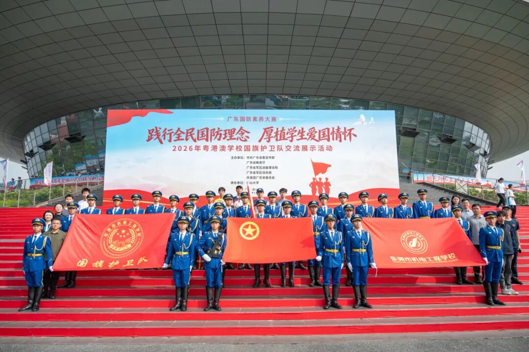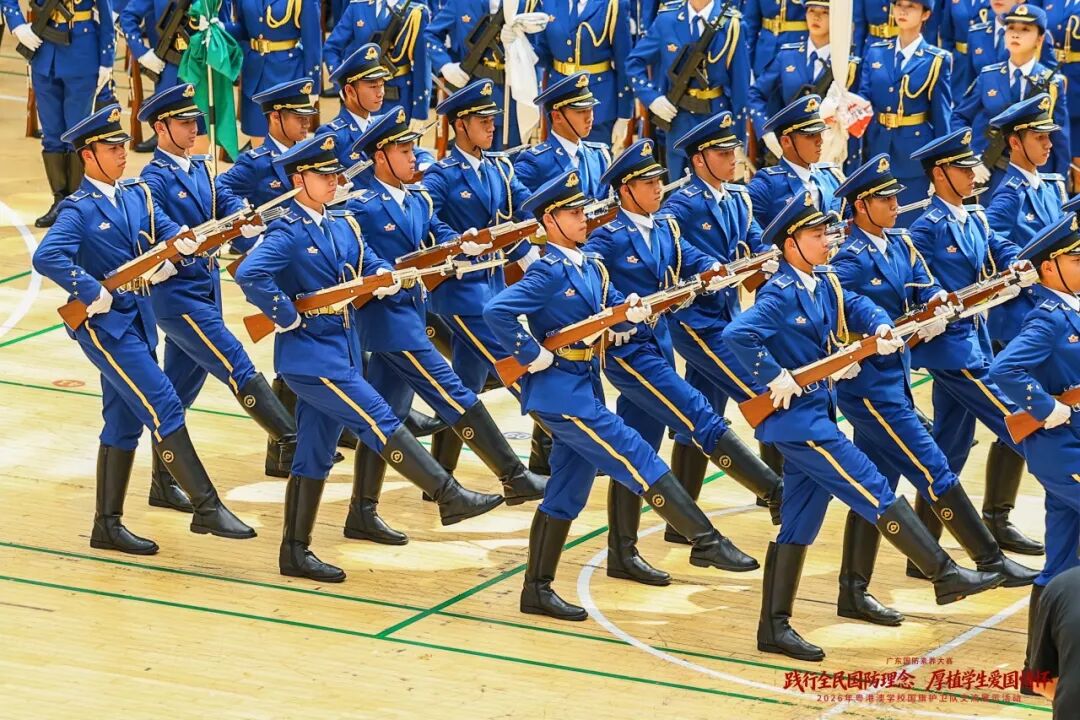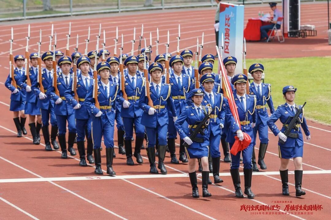 本次活动由中共广东省委宣传部、广东省教育厅、广东省军区战备建设局、广东省军区动员局、共青团广东省委员会联合主办,是粤港澳大湾区极具影响力的爱国主义教育与国防教育品牌赛事,也是落实全民国防教育、厚植青少年爱国情怀的重要实践载体。活动以“践行全民国防理念,厚植学生爱国情怀”为核心主题,汇聚全省21个地市高中阶段学校共37支精英队伍同台竞技、巅峰对决,旨在通过规范的国旗护卫队列展示,展现当代青少年学生的精神风貌,进一步提升青少年国防意识与爱国情怀,让五星红旗在校园高高飘扬。