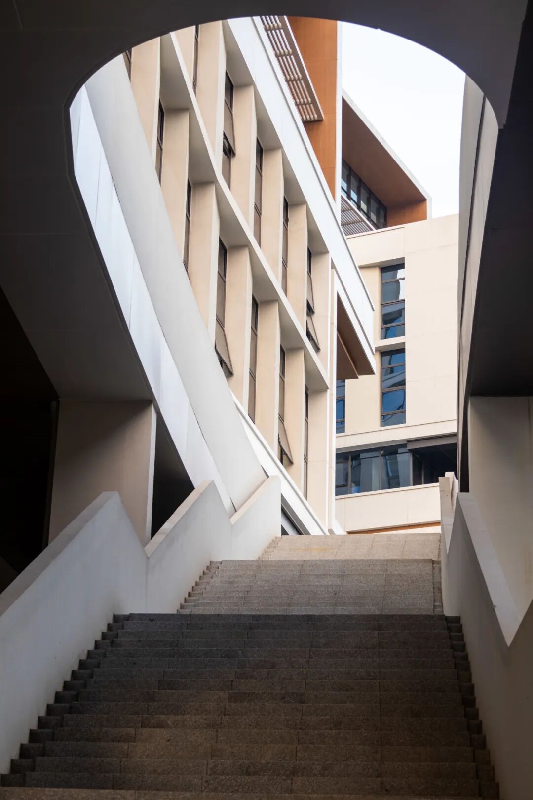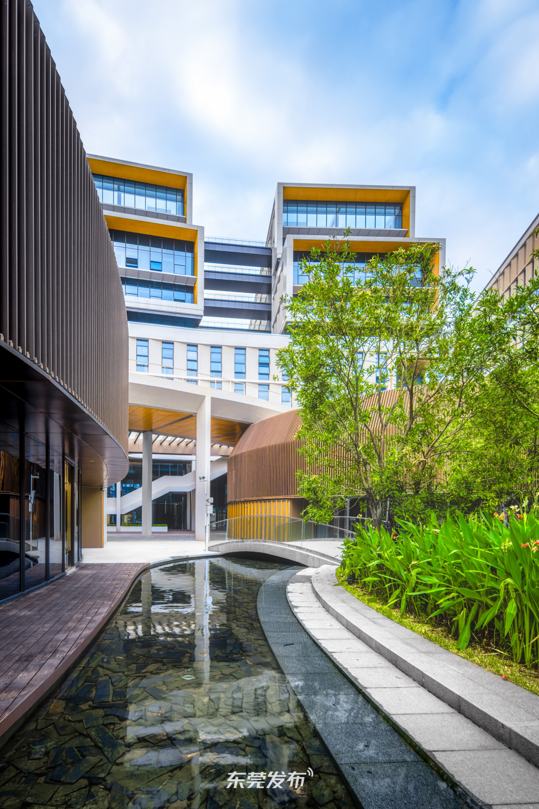 浅蓝色玻璃幕墙再配上木色线条,科研实验楼以“U”形相连,展现出一种理性克制的美,新材料、信息、生命、智能制造等多领域的实验室、平台将在此探索创造。