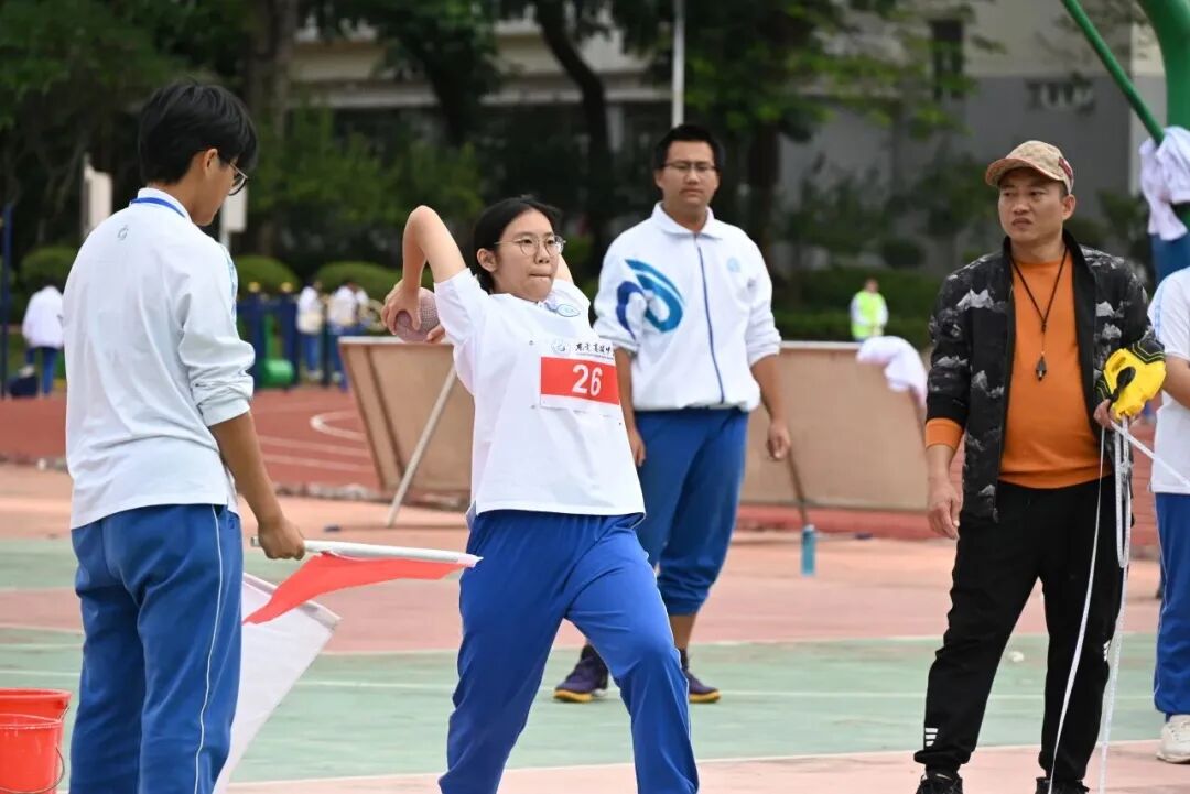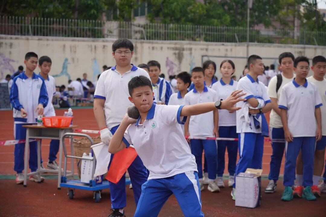 实心球赛场,则是力量的集中展现。瞧!东莞高级中学的运动员们屏息凝神,转身、滑步,汇聚全身力量于瞬间,将沉甸甸的实心球奋力推出,一道道完美的抛物线,彰显着青春的厚重与力量。