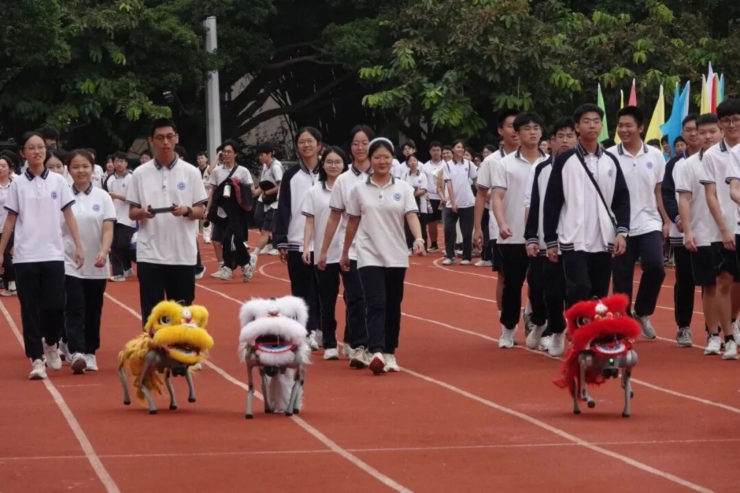 常平中学的开幕式更是将传统民俗、运动激情与科技魅力完美融合,为师生提供了一场视觉盛宴。舞龙舞狮队率先登场,雄狮腾跃间尽显传统活力,机器人方阵迈着精准步伐完成队列变换,闪烁的灯光与机械臂动作默契配合;最后,数十架无人机升空,在空中拼出各种图案,赢得全场师生阵阵欢呼。