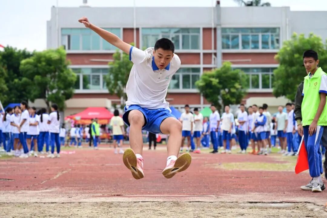 东莞中学初中部麻涌古梅一中的跳远场地中,一道道矫健的身影在助跑后正奋力跃起,于沙坑中留下一个个坚定的足迹。