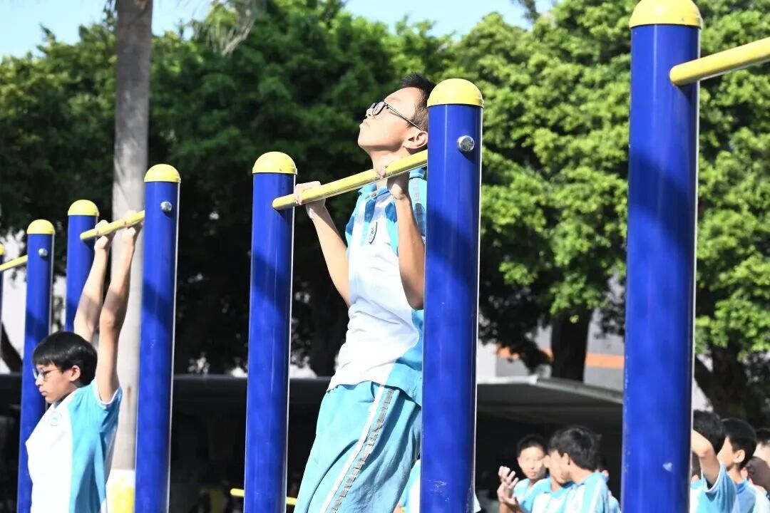单杠上,身体在对抗地心引力。大岭山新风中学的健儿们深吸一口气,肌肉紧绷,下颌稳稳过杠,身体有控制地缓缓落下,每一个动作都写满了力量与坚韧。