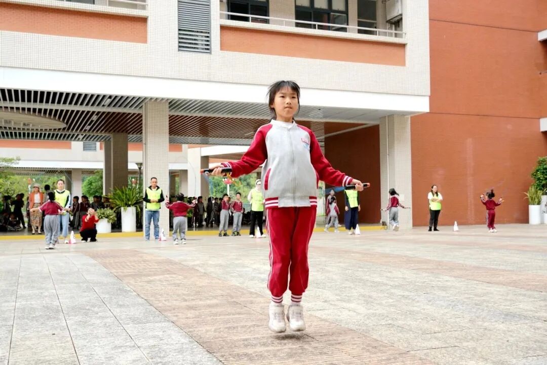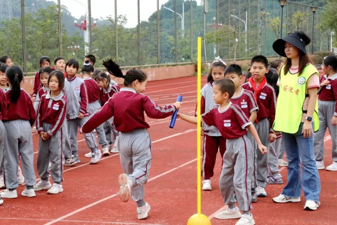 小小的接力棒在凤岗镇中心小学的孩子们手中传递,绷紧的小脸上写满专注,伸手稳准,全力冲向队友。学校的另一赛场上,跳绳比赛正热闹进行。彩绳快速甩动,孩子们脚步轻快地随之跳跃,一个接一个,动作流畅,脸上洋溢着专注又开心的神情。