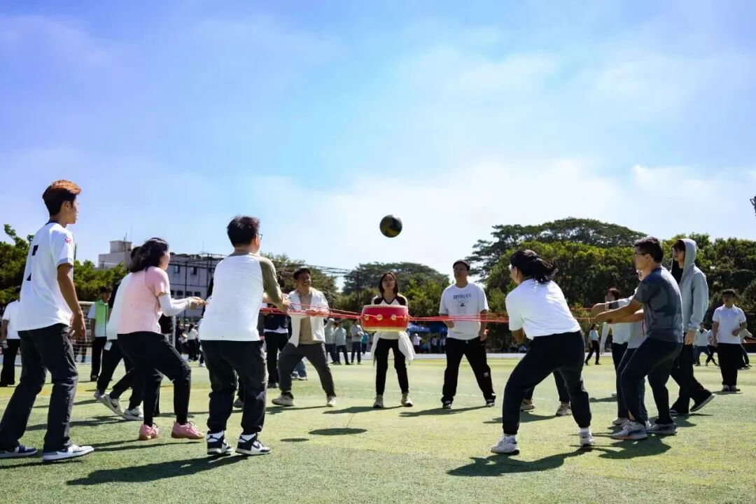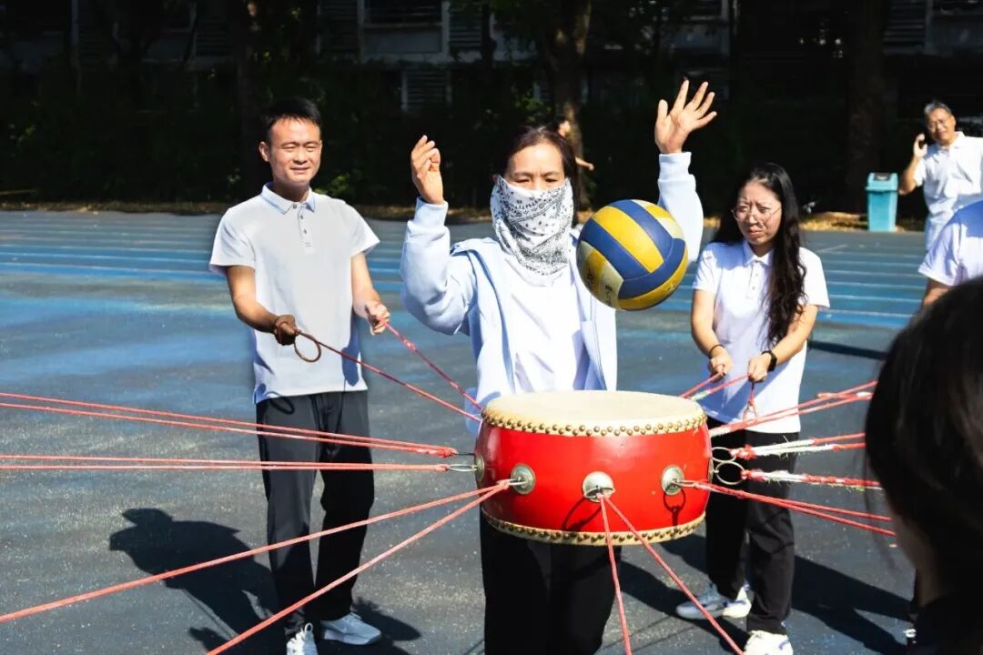 “同心鼓”项目考验着东莞理工学院老师们的默契。一声口令,众人牵绳,沉腕发力,鼓声震天!排球在鼓面上欢快跳跃,每一声脆响,都引来阵阵喝彩。