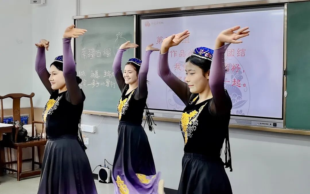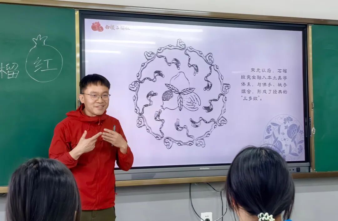活动中,黄松毅与蒋莹老师的双师课《南疆石榴红》,以石榴为文化意象,串联起纹样赏析、美术创作与民族舞蹈,融汇美术、音乐、文学等多学科内容,引领学生从古老的吉祥寓意出发走向“民族团结”的时代主题,以意象贯穿、跨学科协同的方式,实现了美育与文化教育、情感教育的有机融合。