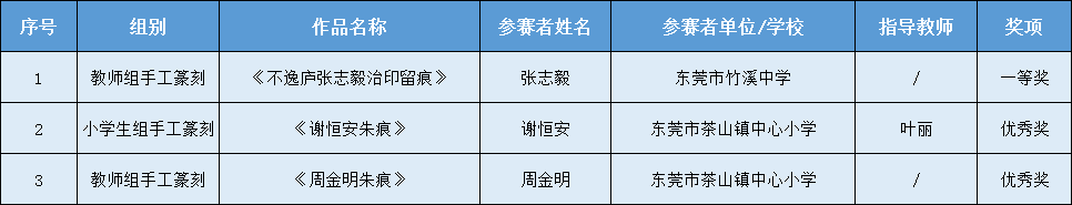 第七届中华经典诵写讲大赛“印记中国”师生篆刻大赛获奖作品名单(东莞)