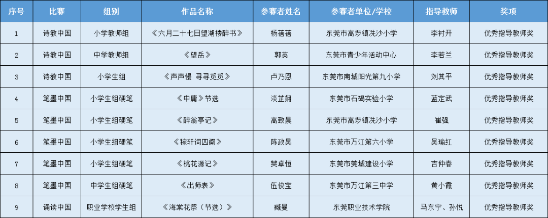 第七届中华经典诵写讲大赛东莞市优秀指导教师获奖作品名单