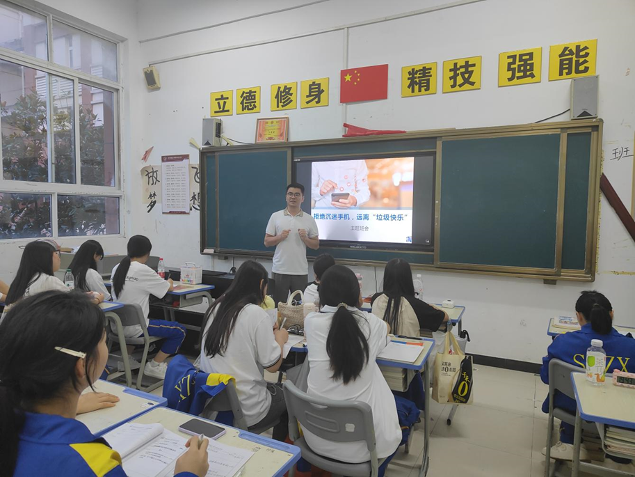初到松桃职校,黄光树观察到部分学生存在过度使用手机的现象,为引导职校学生建立健康的使用习惯,黄光树老师深入多个班级开展手机管理主题的班会。通过互动提问、软件图标识别小游戏等形式快速聚焦主题,结合调查数据与身边案例,直观呈现过度使用手机导致的注意力分散、睡眠质量下降等问题,引发学生共鸣。在分组讨论环节,学生们积极建言,共同梳理出“入校统一保管”“设定使用时限”“培养兴趣替代刷机”等具体可行的班级公约建议。