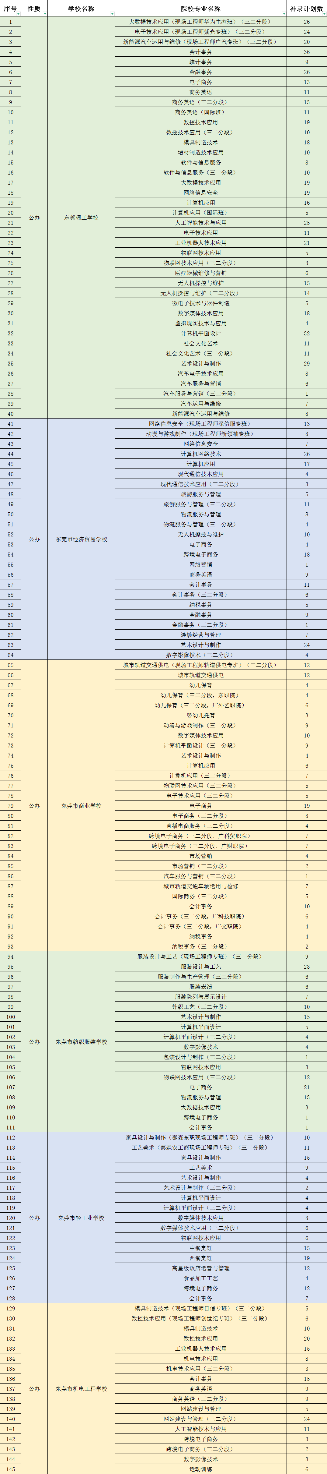 根据《东莞市2025年初中学业水平考试与高中阶段学校招生工作意见》(东教〔2025〕1号)文件要求,第二批录取注册后视招生计划完成情况组织补录。我市2025年中考第二批(公办中职学校、公办技工学校和公办、民办综合高中中职班)的常规录取及注册已于7月28日下午5:00完成,经统计部分学校仍有未完成的招生计划用于补录。现将有关事项公布如下: