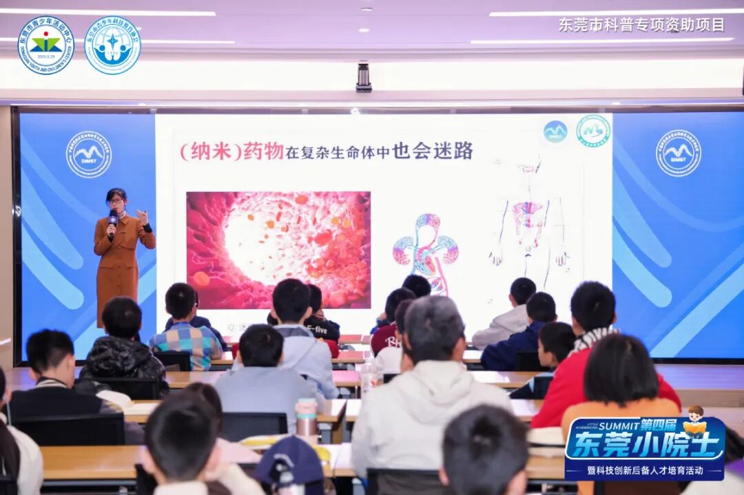 中国科学院东莞材料科学与技术研究所研究员元冰在《给纳米药物装上GPS:靶向递送与精准医疗》讲座中,从大家熟悉的布洛芬止痛原理切入,生动讲解了从人体免疫防线到细胞表面结构的复杂机制,将深奥知识转化为“人体战场”攻防故事。她还巧妙借洗洁精清洁原理类比药物载体设计,启发学生科学思维。