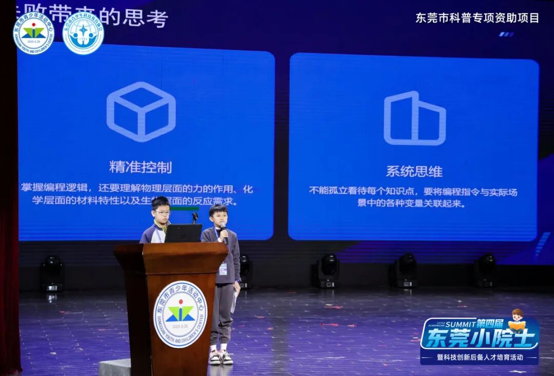 2025年科学营于11月22日启动,37名经严格遴选的学员走进生物岛实验室、广东省新兴激光等离子体技术研究院等科研机构,参与了液体编程、等离子船制作等实践课程。在活动成果分享环节,多位学员讲述了他们的实践经历与思考。来自桥头镇第五小学的叶浩辰和松山湖第一小学的邹怡豪分享了在生物岛实验室操作液体编程时的挫折与收获:因设计疏漏导致实验失败,却由此认识到系统思维的重要性,需统筹考虑水源、阻力等多重因素。