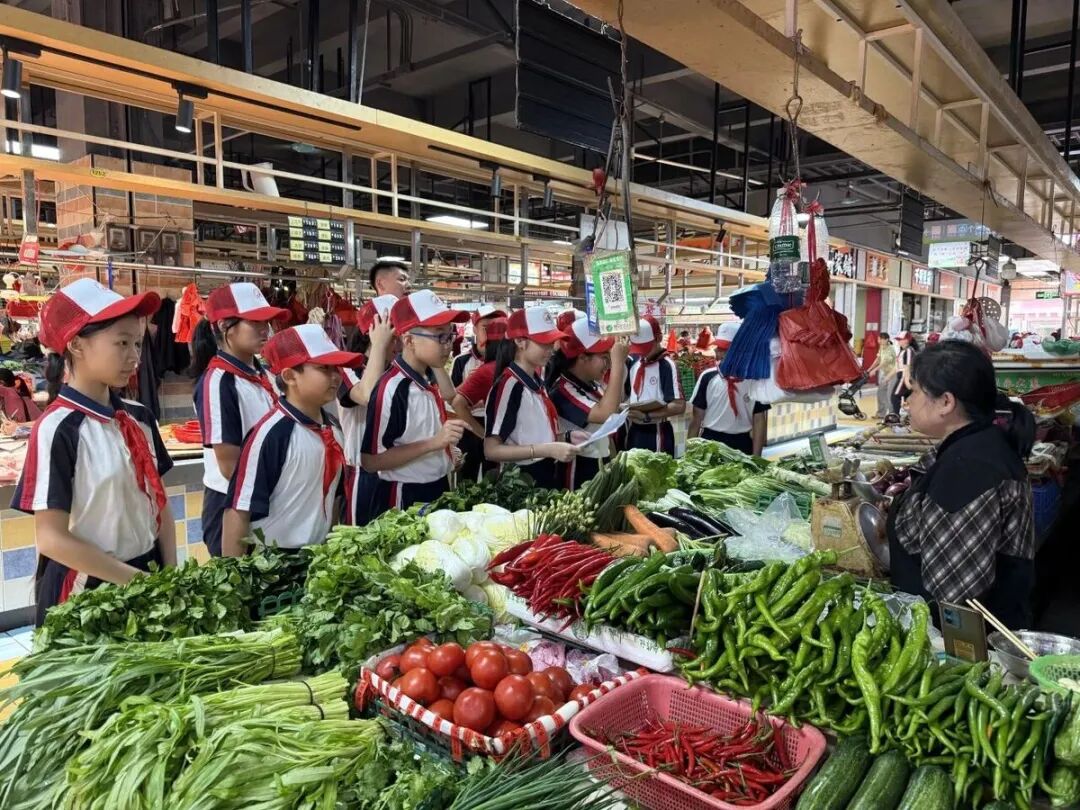 活动现场趣味盎然,学生们以8人一组结成实践小分队,手持购物单、拎着菜篮走进农贸市场,开启采购食材的实践之旅。从最初的不敢开口交流,到主动与摊主询价、比价,甚至大胆讨价还价,孩子们在与摊主的沟通中练就了表达能力。在翻看菜品、挑选食材的过程中练就了辨别眼力。采购环节的精打细算,让孩子们体会到每一分钱的价值,也培养了勤俭节约的意识。学生们的劳动实践能力与综合素养在沉浸式体验中充分展现。