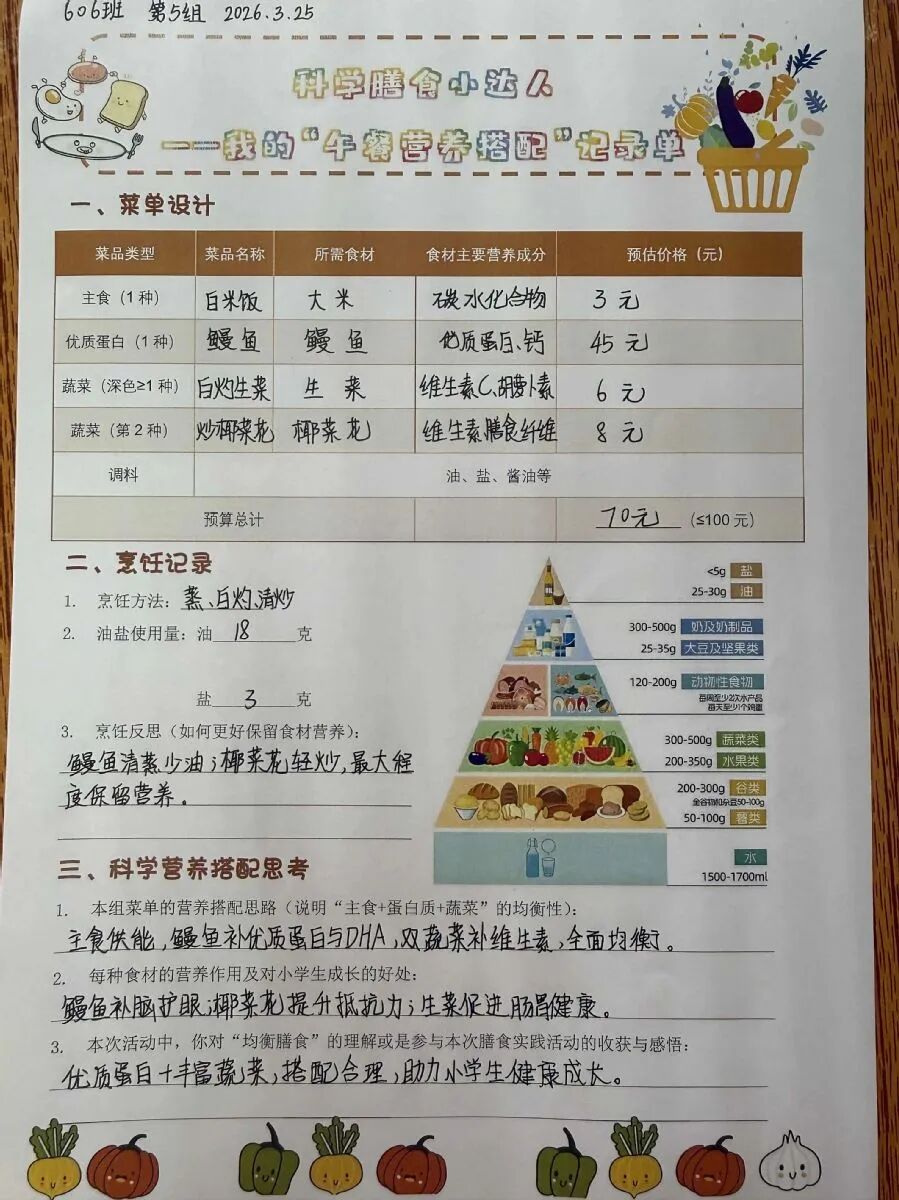 活动开展前,班主任组织孩子们分组规划,确定采购员、记录员、烹饪员等不同分工,孩子们共同商讨制订活动方案,设计菜单、明确流程,提前进入“当家”角色。活动过程中,更是藏着满满的“学科宝藏”:科学学科融入营养搭配知识,孩子们化身“小小营养师”,搭建营养金字塔,做到荤素合理搭配;数学学科体现在采购的每一笔账目中,孩子们变身“出纳”,询价、记账、控制预算,让数学知识走出作业本、融入生活;美术学科让购物单变得创意十足,孩子们手绘插图、标注食材,让买菜充满仪式感;语文学科则在活动后落地,孩子们将实践中的经历与感悟写进心得,字里行间皆是成长的味道。