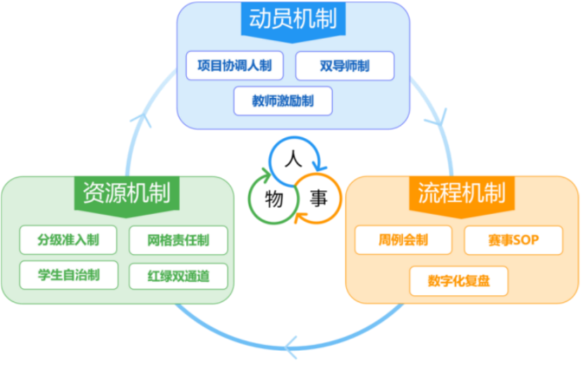从人员、资源、流程三个维度系统设计运行机制,南城一中打造的覆盖“人、事、物”的闭环管理体系,让科学教育从“一时热”变成“长久红”。人员协同上,“项目协调人制”明确跨学科合作,“双导师制”分场景落地,科创社团采用“专业+思政”组合,竞赛备赛用“学科+班主任”搭档,实现全方位育人;资源管理上,实行功能室“网格化”责任制、设备分级准入制与“红绿双通道”采购机制,既保障了安全规范,又提升了资源利用效率;流程优化上,借助数字化平台建立“赛事看板”和活动复盘库,让经验可沉淀、模式可迭代。这种“制度+数智”的双轮驱动,让科学教育不再依赖个人经验,而是形成标准化、可复制的运行模式,为可持续发展奠定了坚实基础。
