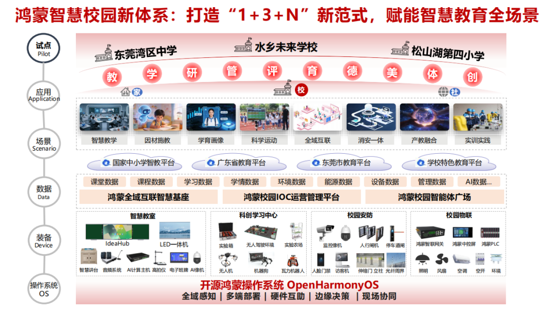 为落实市委、市政府建设“鸿蒙之城”的工作部署,市教育局联合华为公司深入研究鸿蒙技术教育应用落地场景,初步形成鸿蒙智慧校园“1+3+N”全域协同试点方案,构建1个市级教育数字基座、3所标杆试点校、N个创新应用场景的全域协同试点架构,让莞邑学子在万物互联的智慧校园中享受更有温度、更具品质的未来教育。