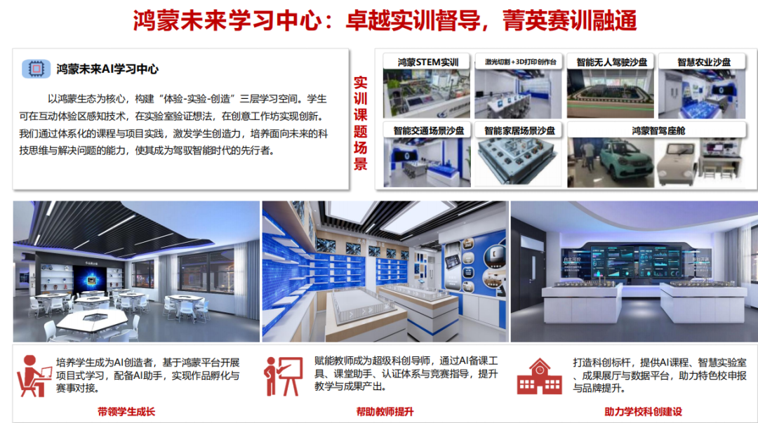 鸿蒙未来学习中心:建设集自主学习、虚拟实验、创新工坊于一体的未来学习空间,依托鸿蒙流转技术,学生可随时随地调取数字资源,生成个性化学习画像,实现“千人千面”的泛在学习。