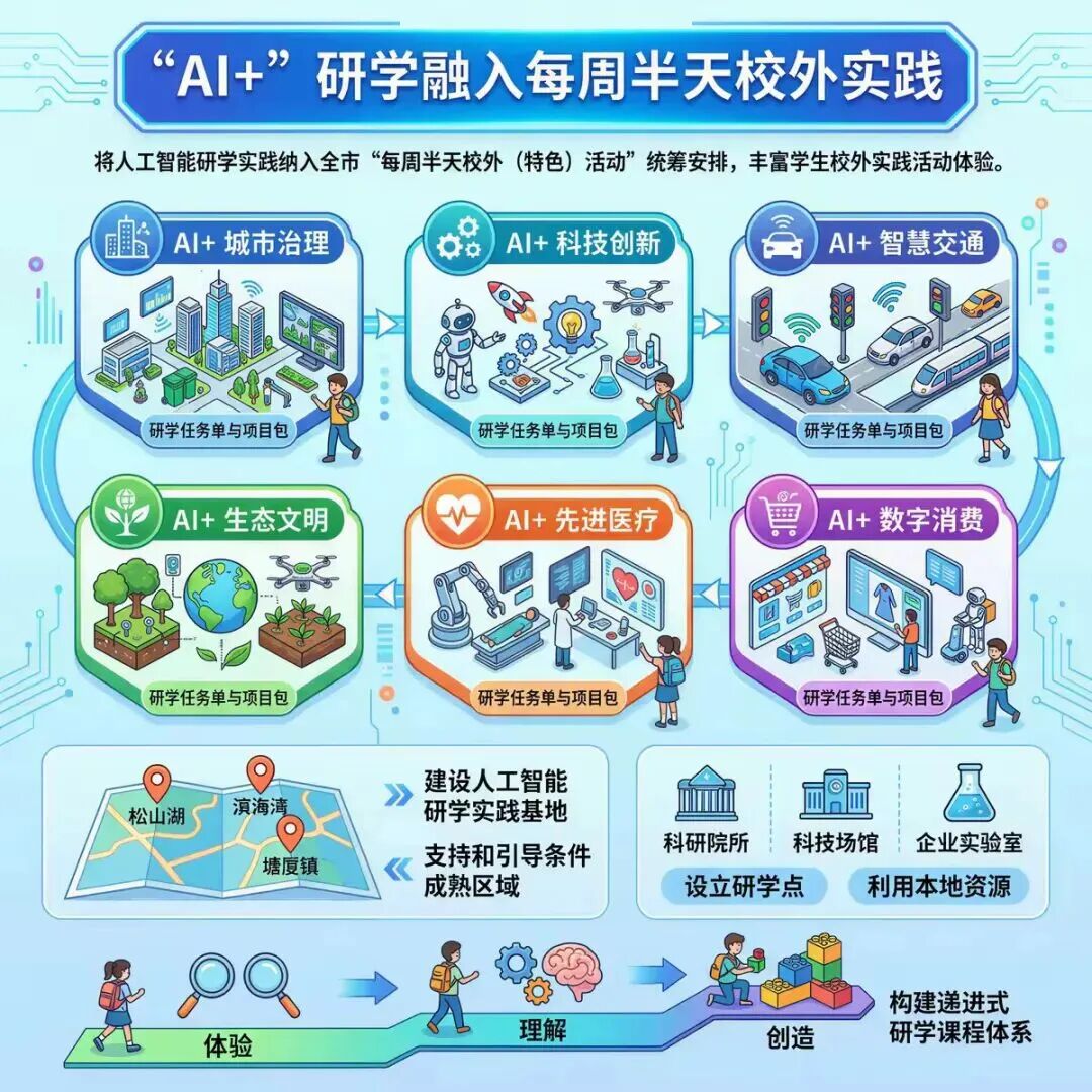 将人工智能研学实践纳入全市“每周半天校外(特色)活动”统筹安排,开发“AI+城市治理”“AI+科技创新”等6个系列研学任务单与项目包,构建“体验—理解—创造”递进式研学课程体系,促进课堂学习与真实场景贯通。